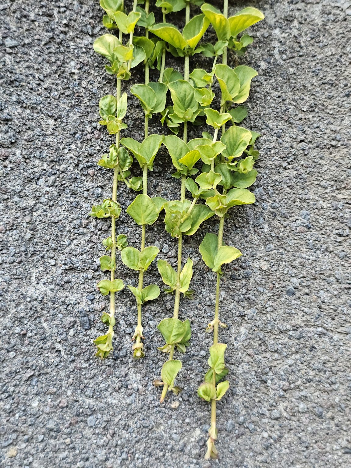 Alternative Text: Several strands of green creeping vines hang on a stone wall near Pittock Mansion, Portland. Captured close-up in the evening.
