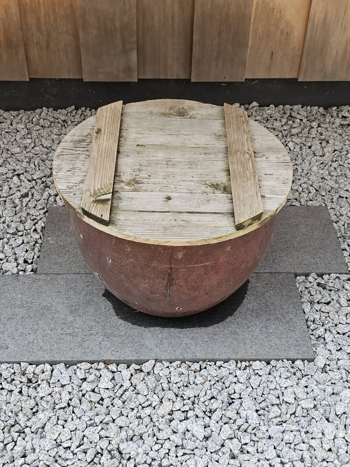 Alternative Text: A half-buried pot with a wooden lid placed on top, sitting on gravel. Captured at Portland Japanese Garden.