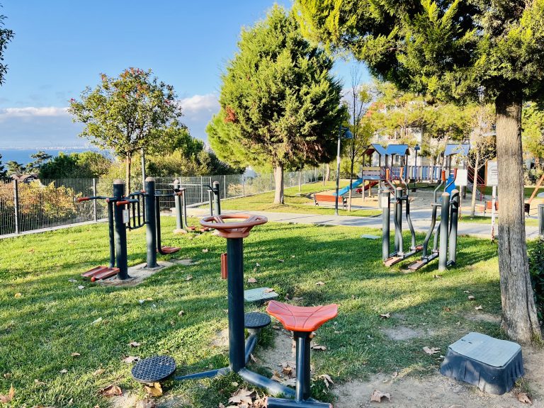 Alternative Text: Outdoor workout equipment on grass with a playground in the background.