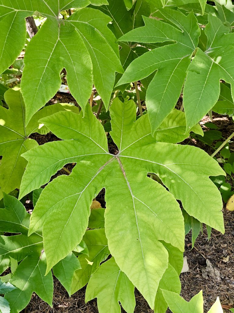 Alternative Text: Large, bright green leaves of a Rice Paper Plant (Tetrapanax papyrifer) growing in shade. Captured from the Oregon Zoo, Portland.