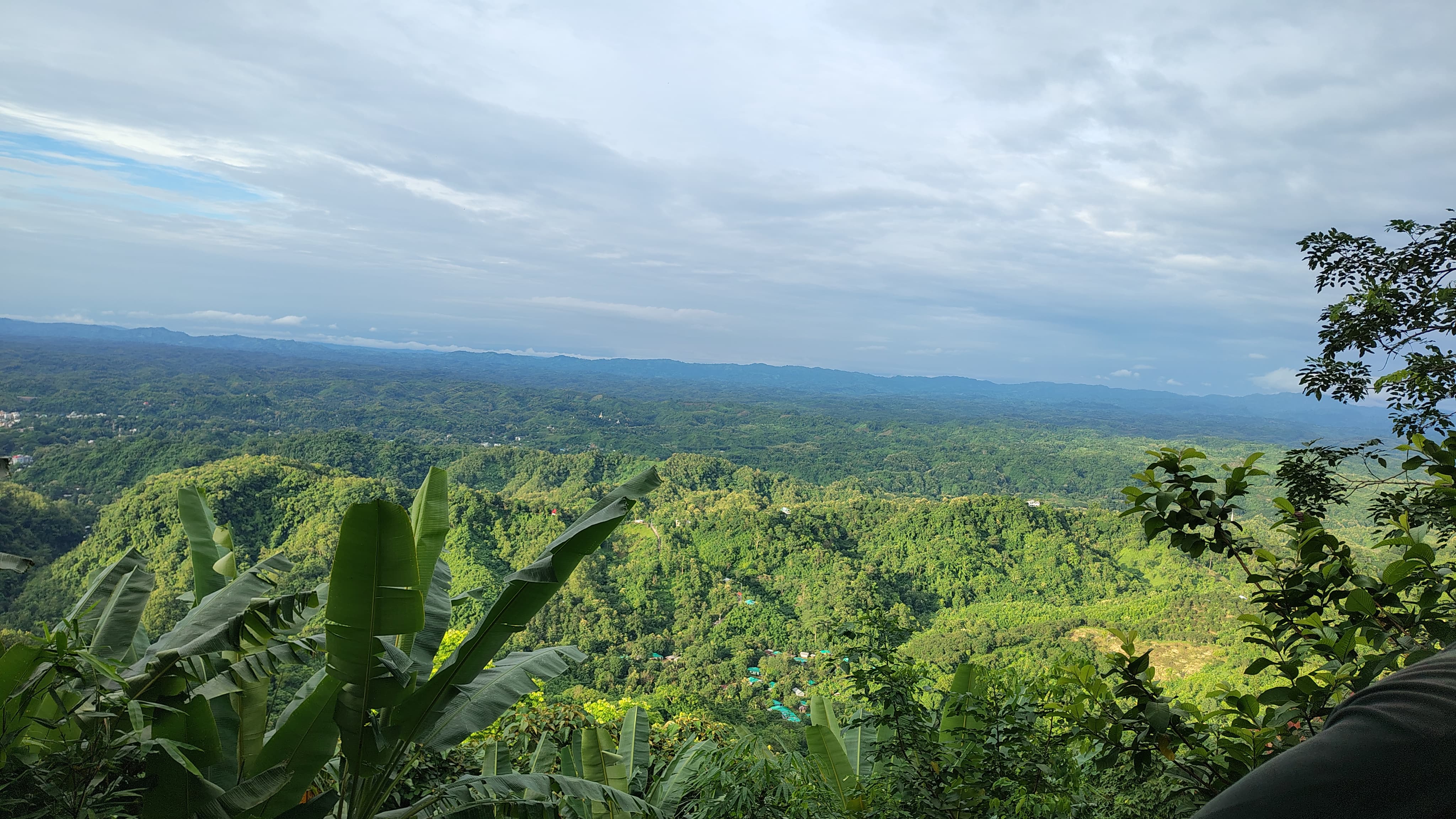 Alternative Text: A panoramic view of a lush green landscape, featuring rolling hills covered in dense vegetation under a partly cloudy sky.
