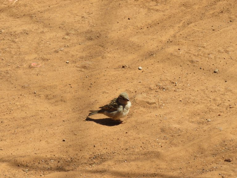 Alternative Text: Small brown and grey bird standing on dry reddish dirt under bright sunlight, casting a shadow.