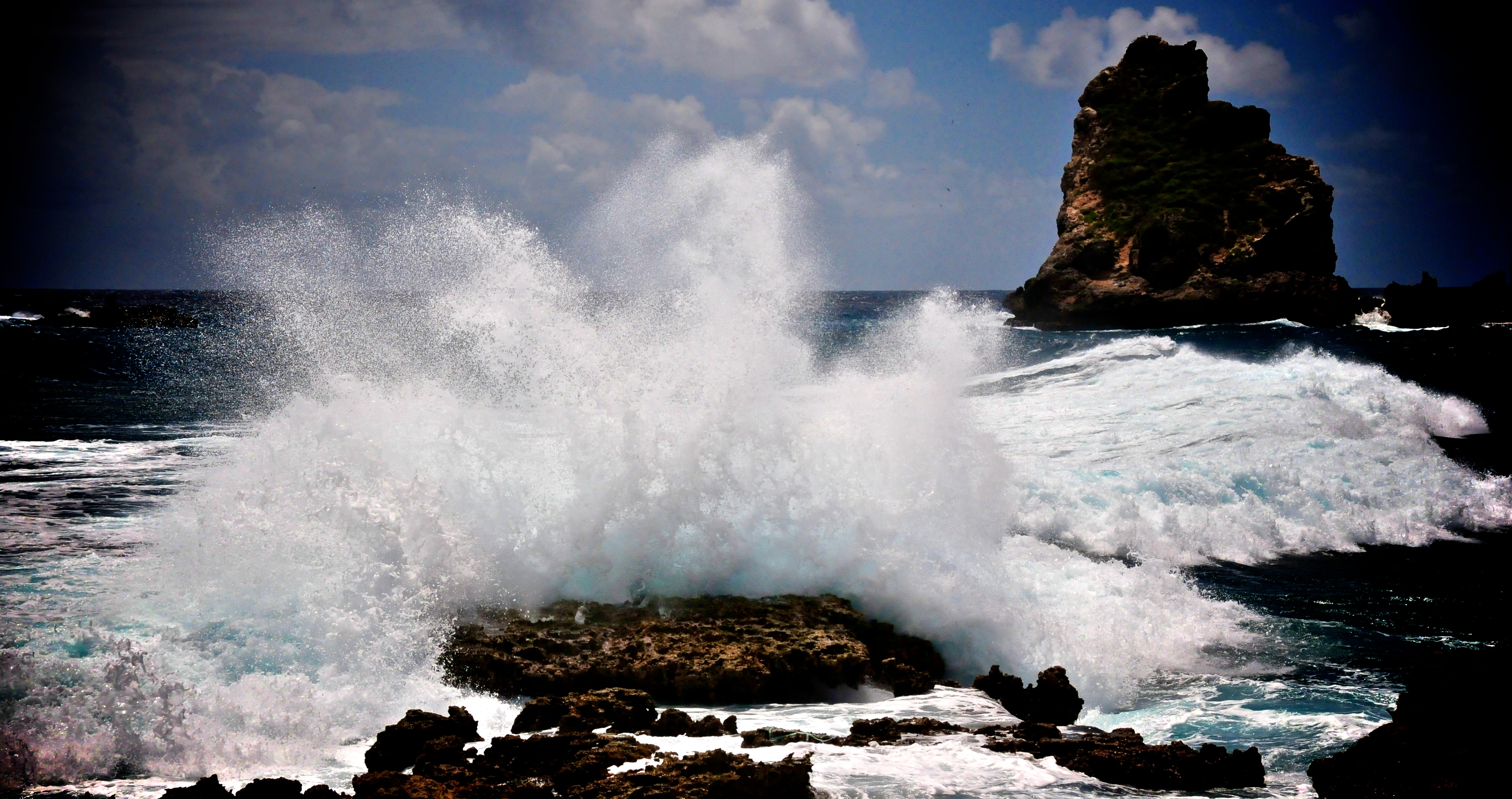 Alternative Text: Bursting wave at the Pointe des Châteaux, Guadeloupe