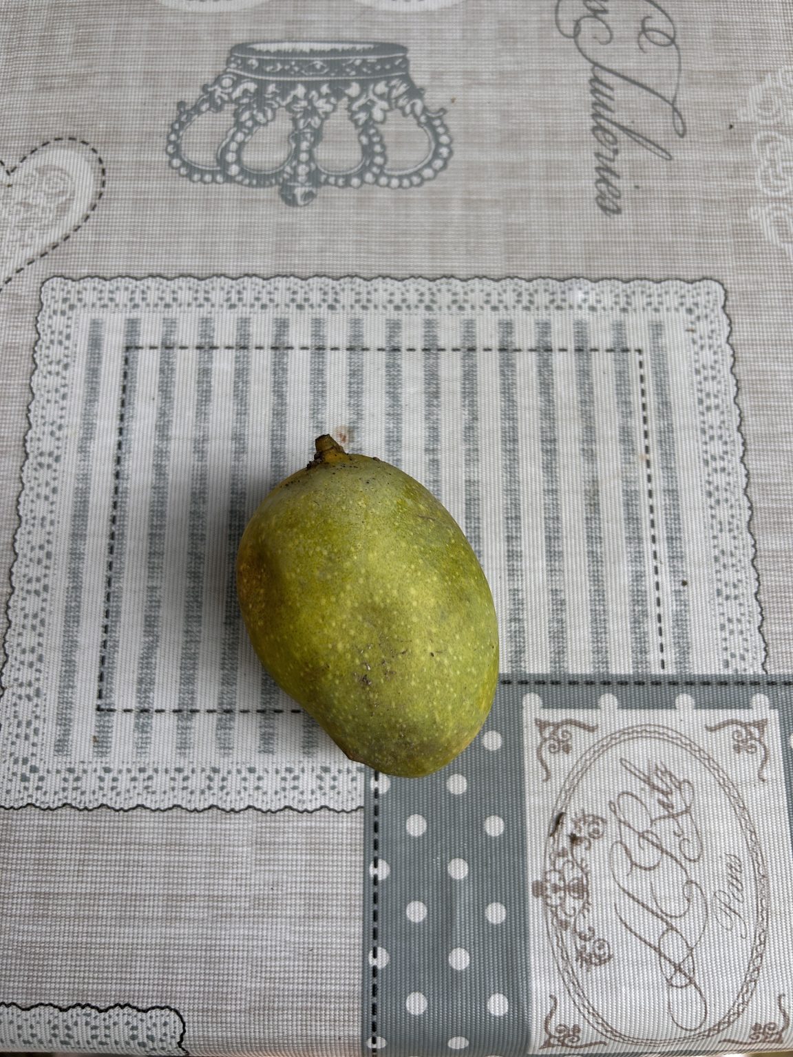 Alternative Text: A single, unripe mango with a greenish-yellow skin sits on a textured tablecloth featuring various patterns, including stripes and polka dots in soft gray tones.