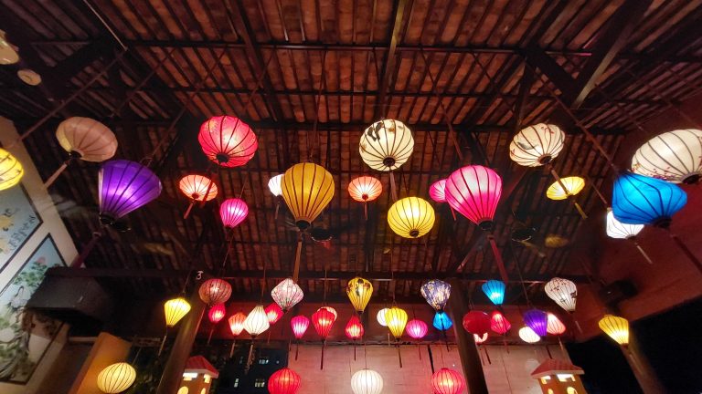 Alternative Text: A vibrant collection of colorful, illuminated lanterns hangs from a wooden ceiling, creating a festive atmosphere in Vietnam.