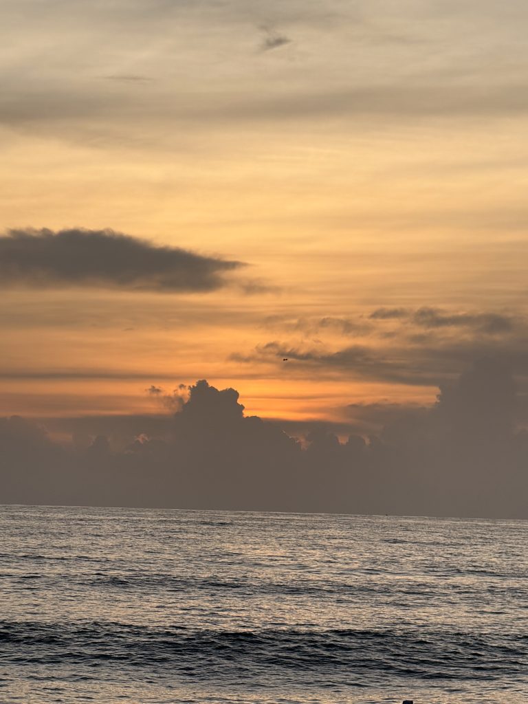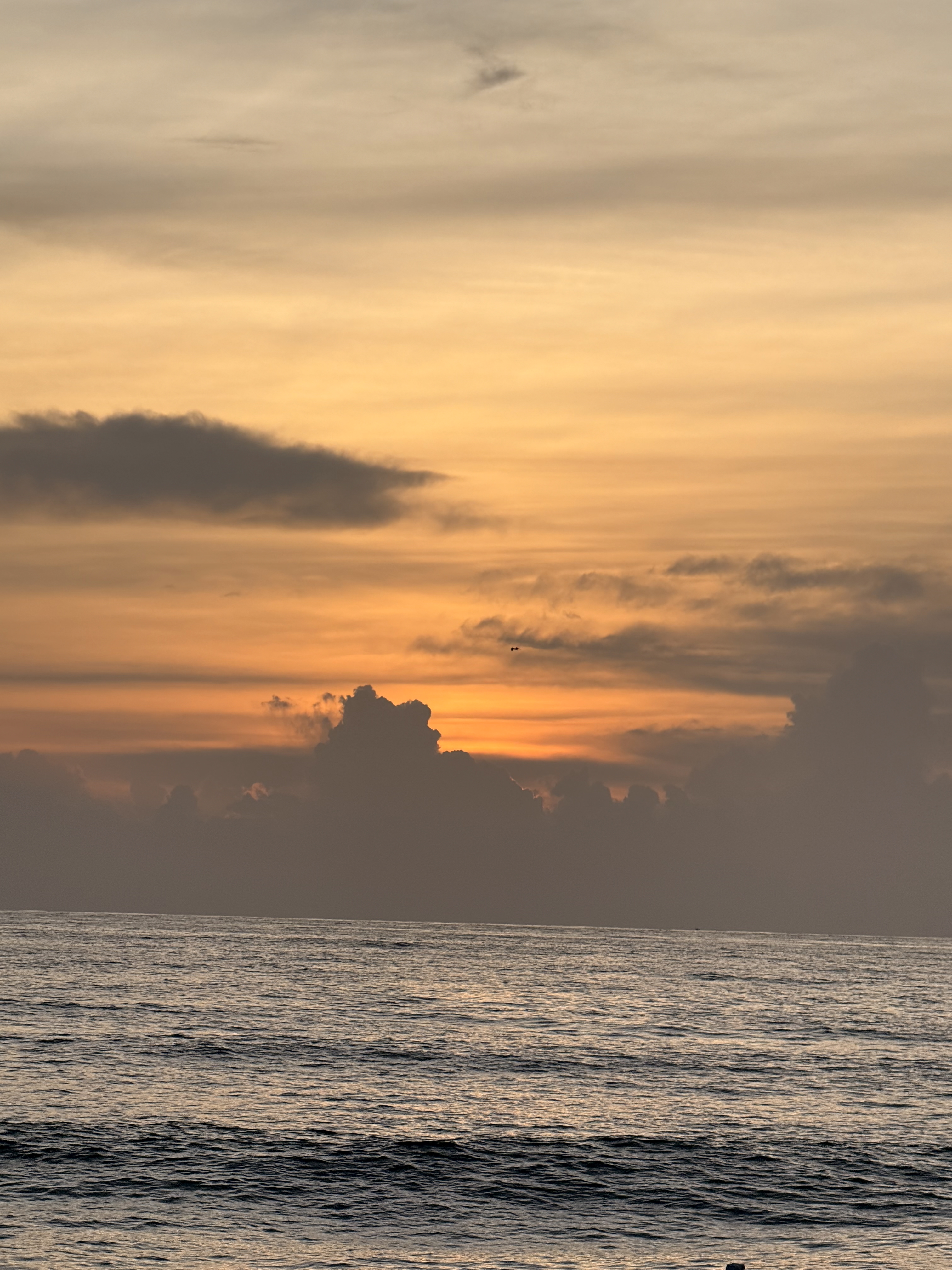 Alternative Text: A deep orange sunset behind dark clouds over the Arabian Sea, seen from Cherai Beach, Ernakulam.