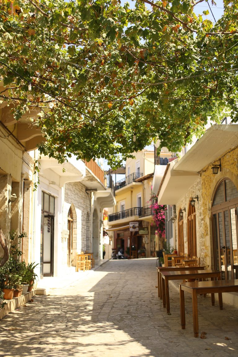 Alternative Text: Cobblestone street lined with cafes, shops, and trees with string lights in a quaint town.