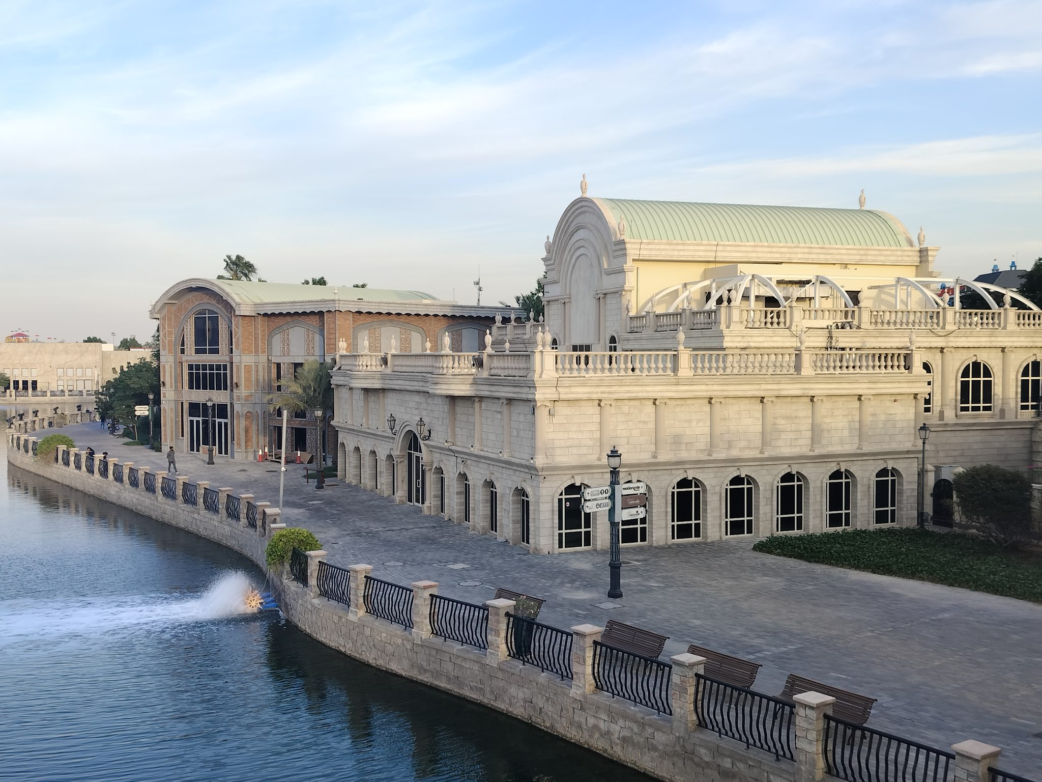 Alternative Text: Riverland, Dubai. Large stone building witha. walkway by water.