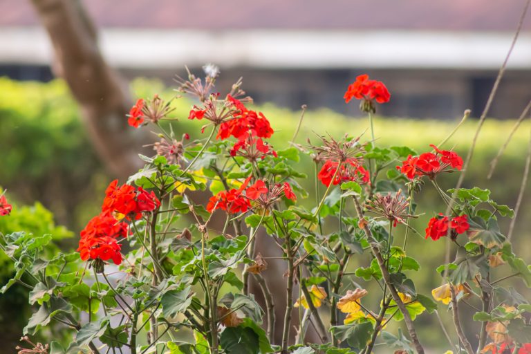 Alternative Text: A cluster of vibrant red geranium flowers surrounded by green foliage, with a blurred background of leaves.