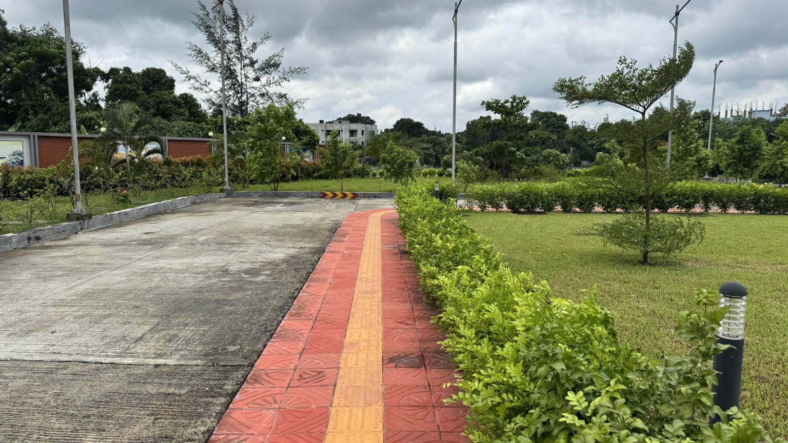 Alternative Text: A pathway curves through a landscaped area, featuring a red and orange tiled walkway bordered by lush greenery.