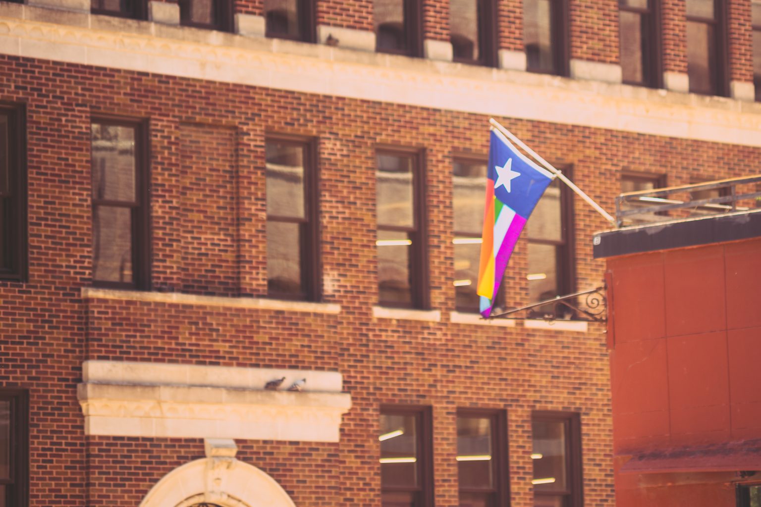 Alternative Text: A Flag hangs on a diagnal from the side of one building. The flag is styled after the Texas flag with a lone star but instead of the two stripes it features multiple rainbow stripes. The background is a brick building.