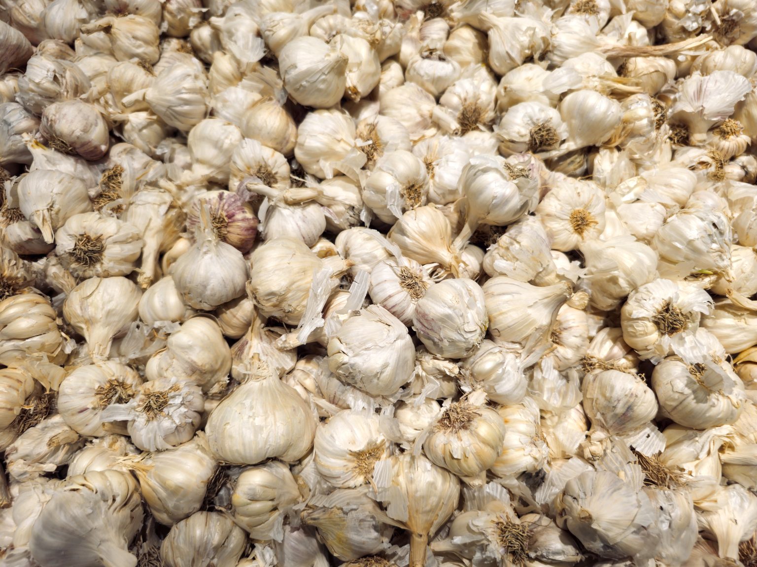 Alternative Text: A large heap of fresh garlic bulbs displayed in a hypermarket in Kozhikode, Kerala. The dry outer skins and natural earthy tones show their freshness and strong aroma.