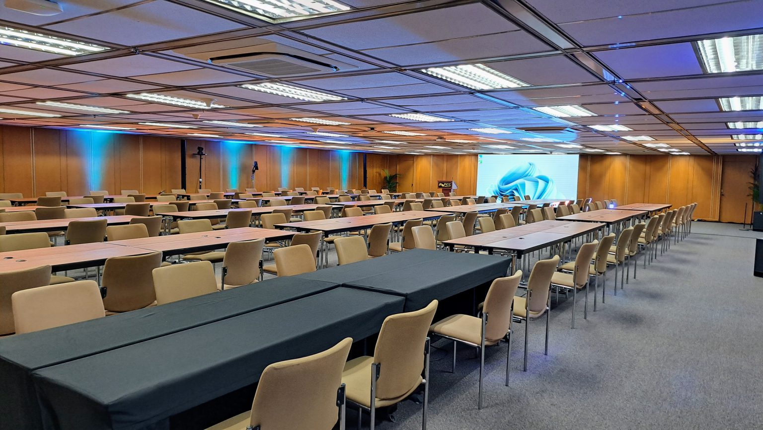 Alternative Text: A spacious conference room is set up with multiple rows of tables and chairs.