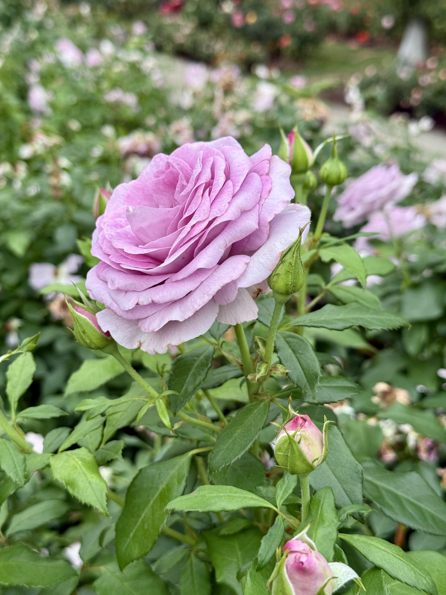 Alternative Text: A purple rose in partial bloom surrounded by buds and green foliage, showing fine petal details. Taken in the evening at the International Rose Test Garden, Portland.