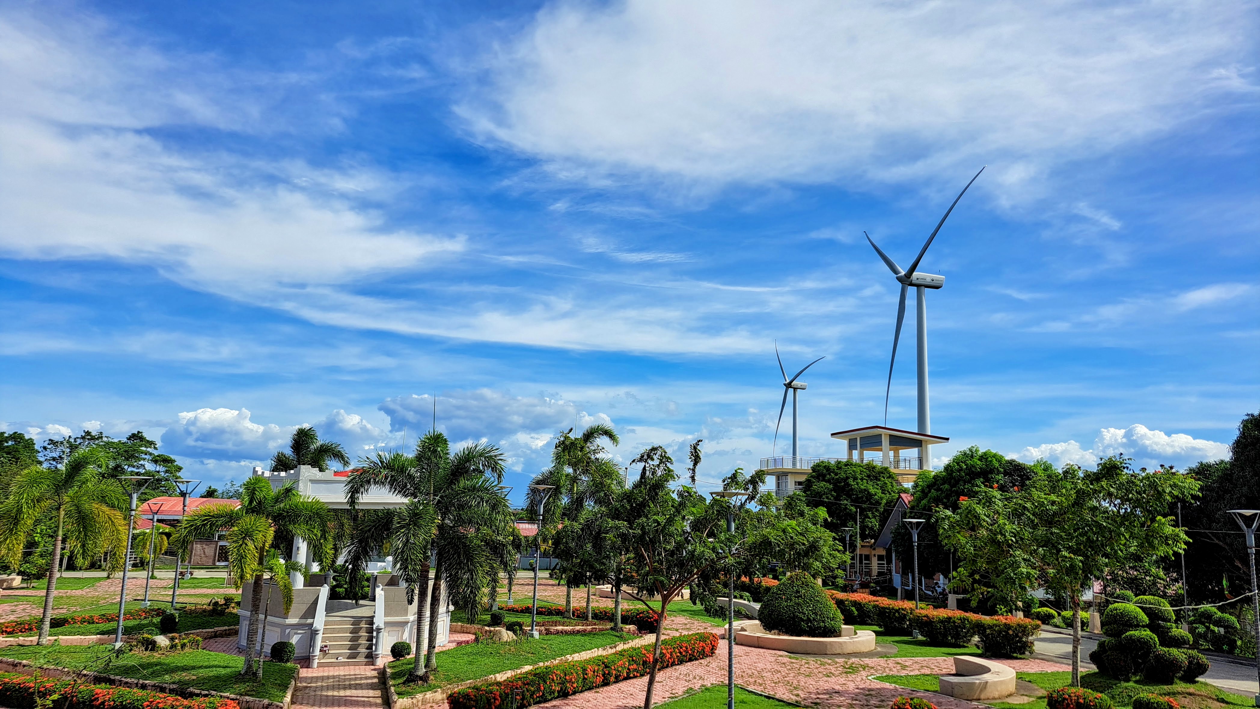 Alternative Text: A scenic park with palm trees, a white gazebo, and landscaped paths. In the background, wind turbines rise against a blue sky filled with white clouds, suggesting a blend of nature and sustainable energy.