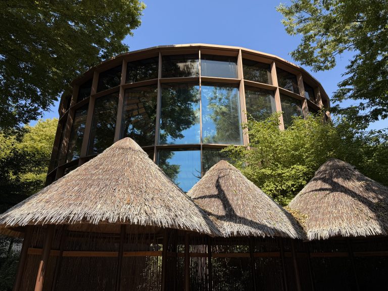 Alternative Text: A modern circular building with large glass windows stands above three traditional thatched-roof huts, reflecting the surrounding trees and nestled in lush greenery under a clear sky at the Oregon Zoo in Portland, Oregon.
