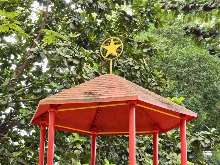Alternative Text: A bright red gazebo with a yellow star on top, nestled among lush green trees, captured in Fort Kochi, Kochi, a pop of color in a tropical park.