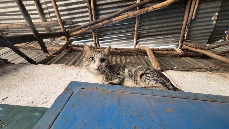 Alternative Text: A cat on top of a metal box with a wall in the background with iron sheets supported by wooden poles.