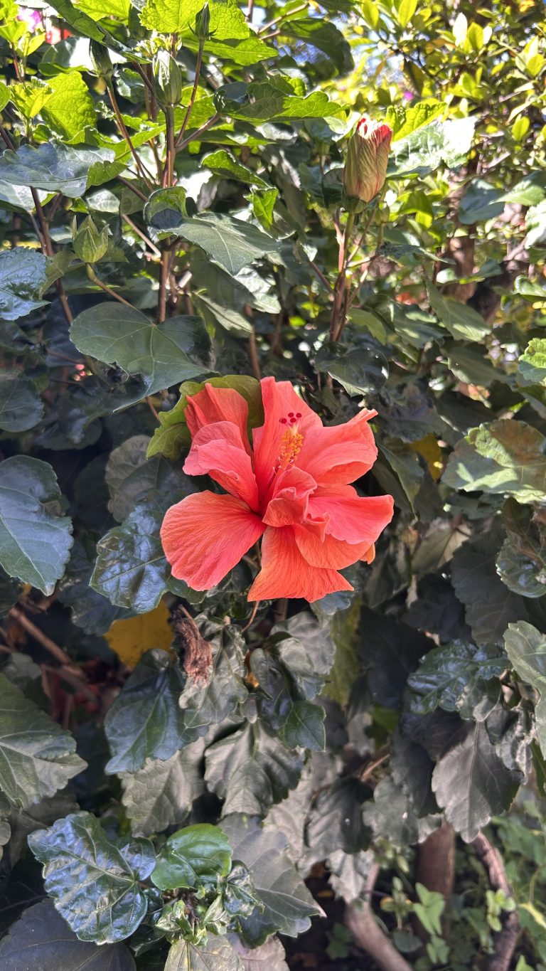 Alternative Text: A vibrant orange hibiscus flower stands out against a backdrop of green leaves, with a few budding flowers nearby.