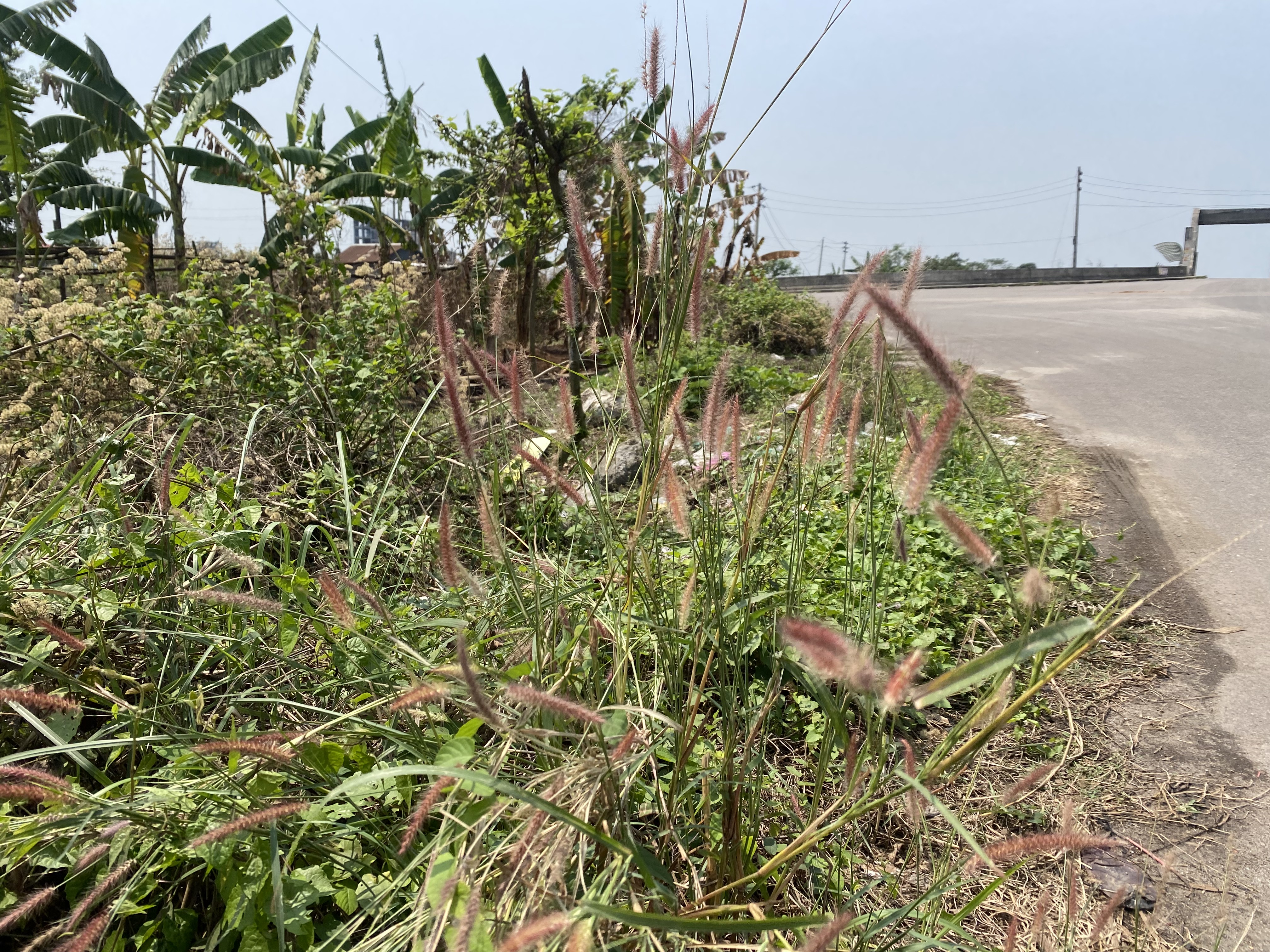Alternative Text: Tall grass with feathery pink tips grows beside a sunny, curved road. Green foliage and banana trees line the background under a clear sky.