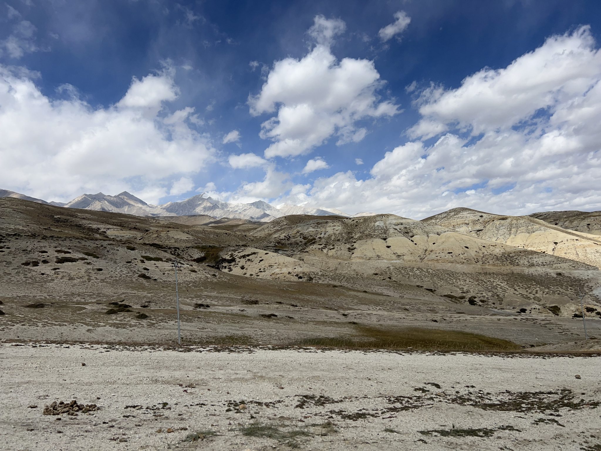 Alternative Text: A vast, arid landscape featuring rolling hills and mountains in the background under a partly cloudy sky
