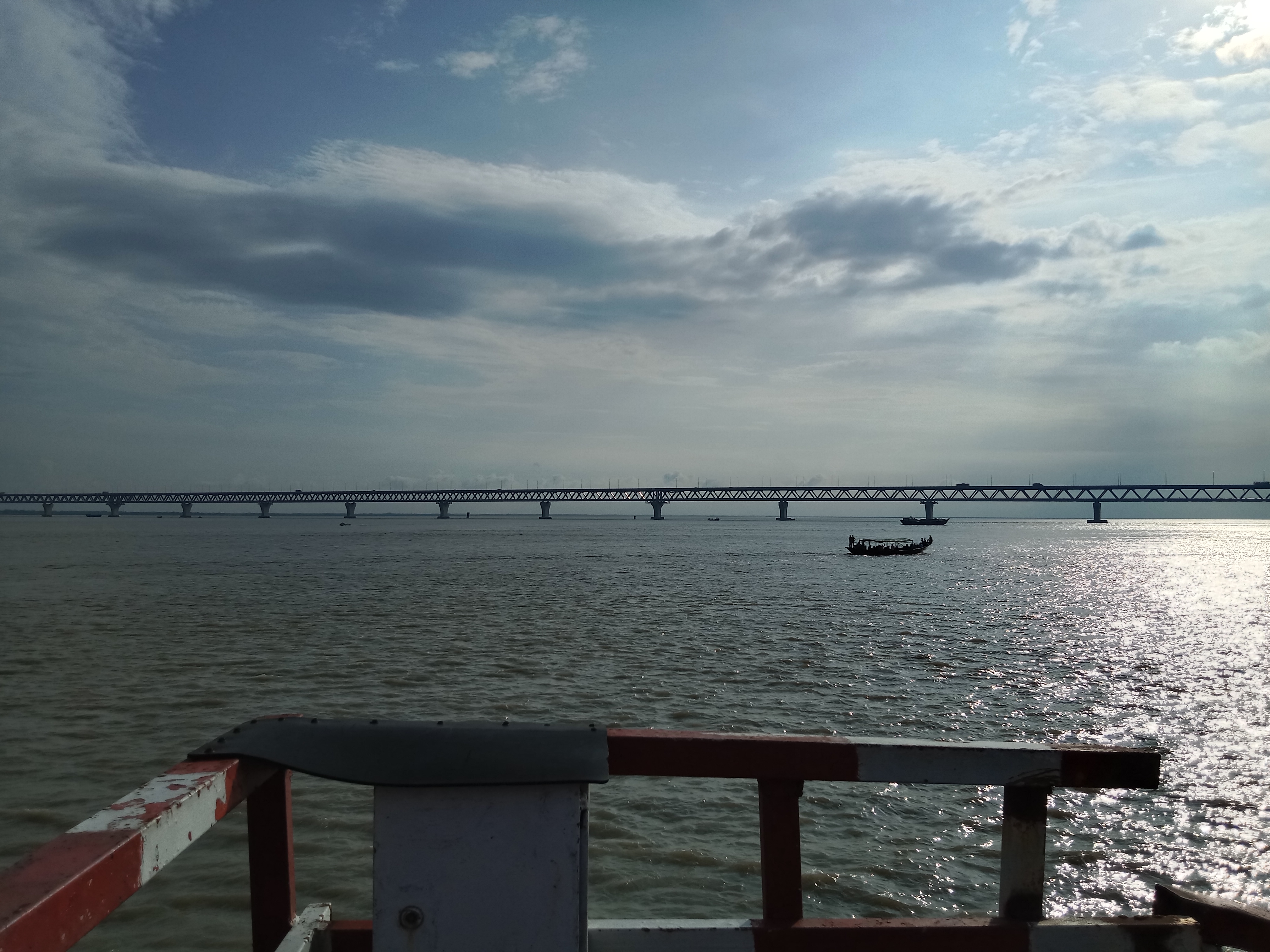 Alternative Text: Scenic view of Bangladesh’s Padma Bridge under a partly cloudy sky, with a small boat gliding on the sunlit river in the foreground.