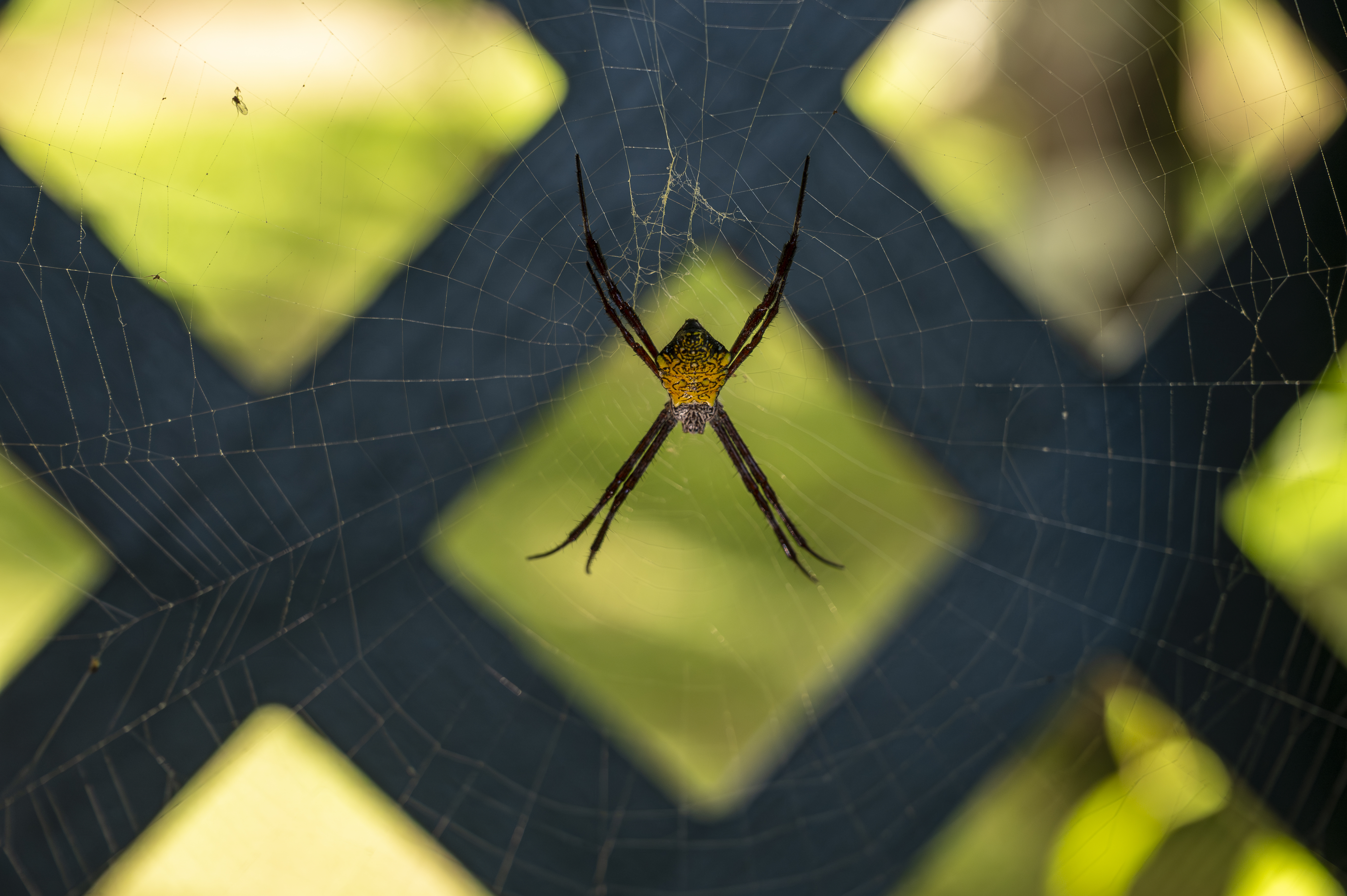 Alternative Text: A yellow-orange Argiope appensa, also know as a Hawaiian Garden Spider makes an “X” while resting on it’s web in front of an “X” shaped lattice with a bright green background.