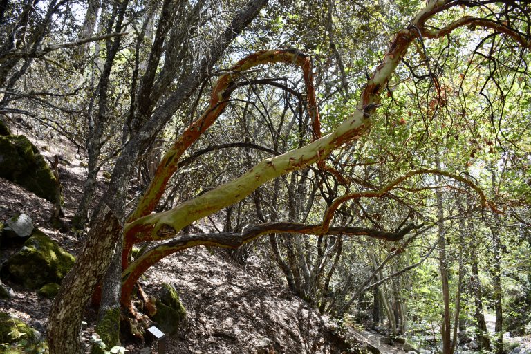 Alternative Text: This picture shows a Strawberry Tree (likely Arbutus unedo or Arbutus andrachne) with its distinctive reddish-brown peeling bark and green leaves. It grows in a rocky, natural setting typical of Mediterranean mountain areas like the Troodos Mountains, Cyprus.