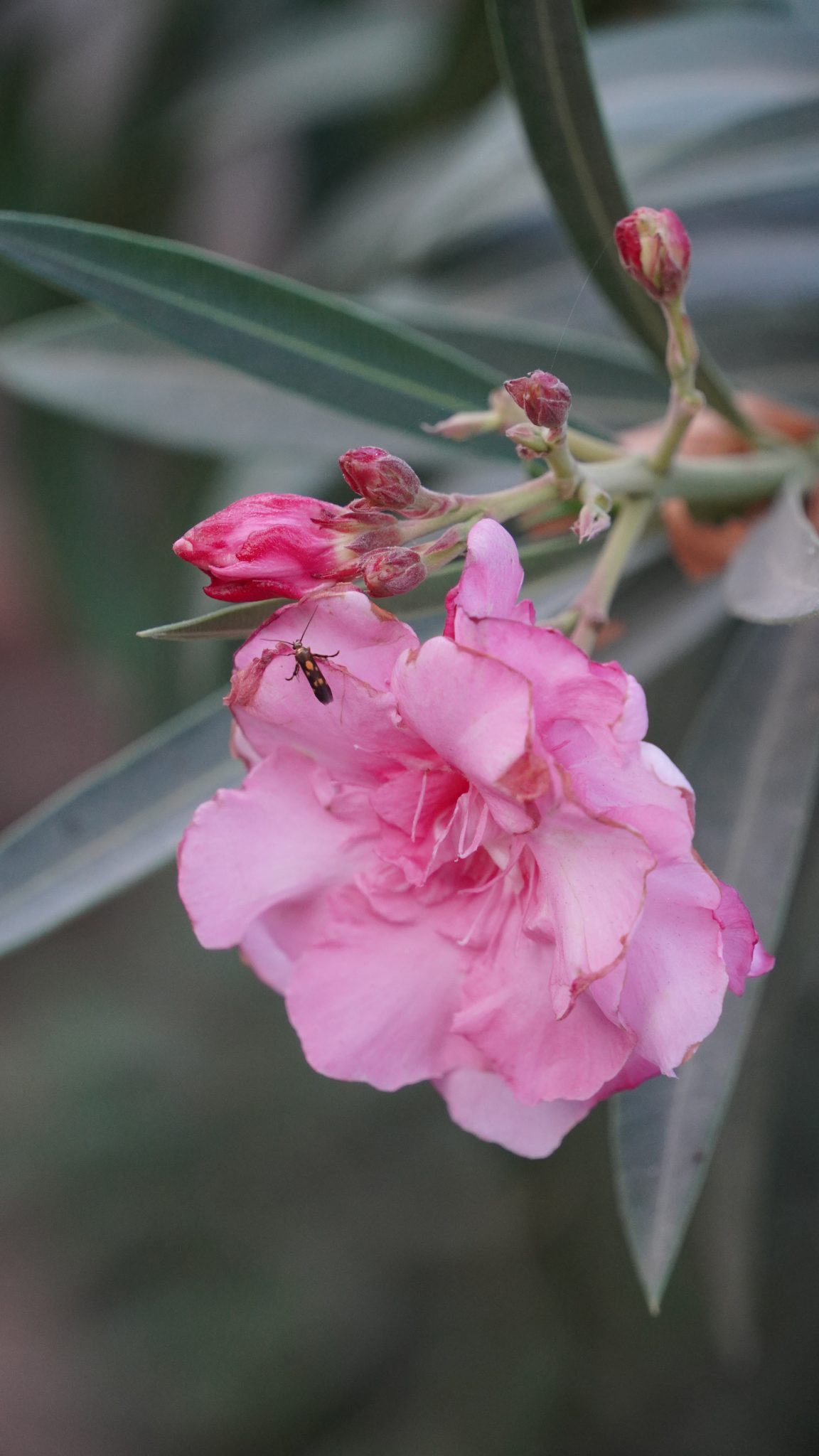 Alternative Text: A delicate pink flower blooming with a flying insect sitting on one of the petal with its leaves in the background, embodying nature’s joy and pure happiness.