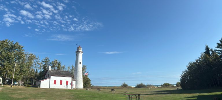 Alternative Text: A white lighthouse with red shutters on a vast green lawn under a clear blue sky. Sturgeon Point Lighthouse, Michigan.