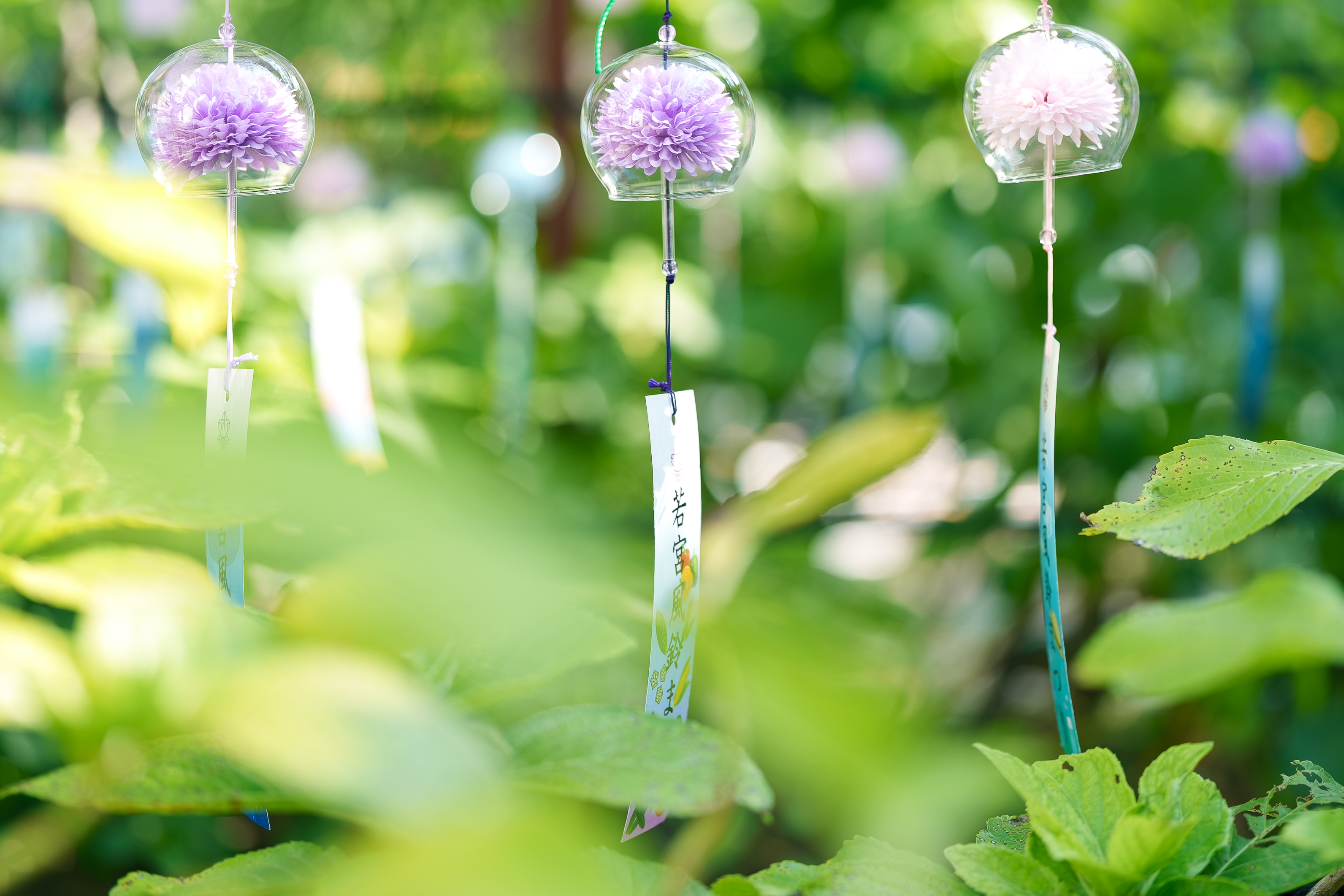 Alternative Text: Glass wind chimes with delicate artificial flowers hanging in a lush green garden. A tranquil summer scene that evokes Japanese tradition, serenity, and seasonal beauty.