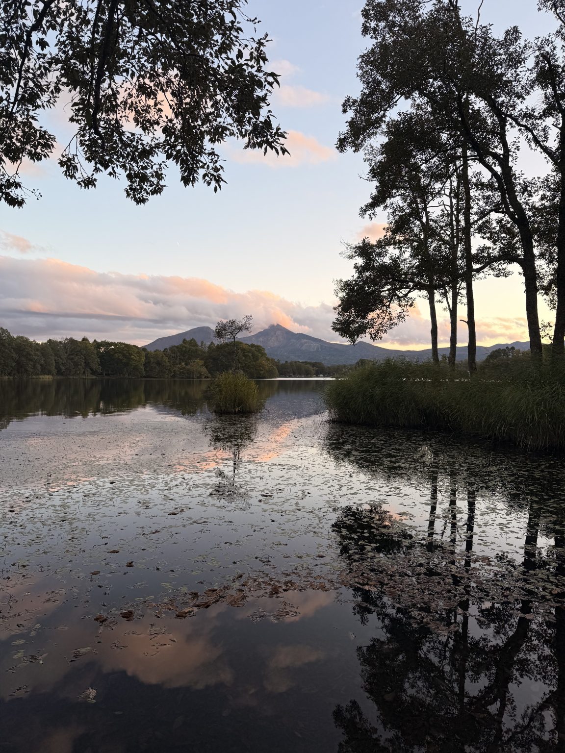 Alternative Text: A serene landscape featuring a calm lake reflecting the sky and surrounding trees. In the background, rolling hills and a mountain are visible under a pastel-colored sunset sky. The foreground shows the water’s surface covered with fallen leaves, and the silhouettes of trees frame the scene, adding depth to the tranquil atmosphere.
