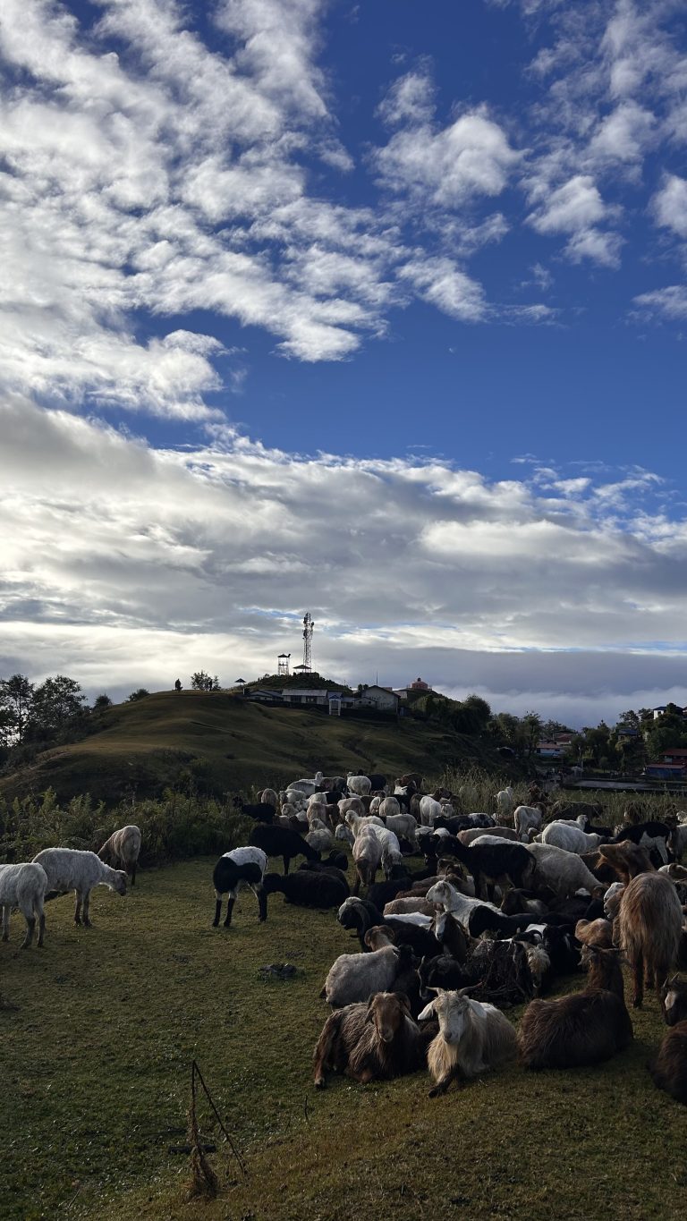 Alternative Text: A large group of goats and sheep grazing on green grass in a hilly landscape.