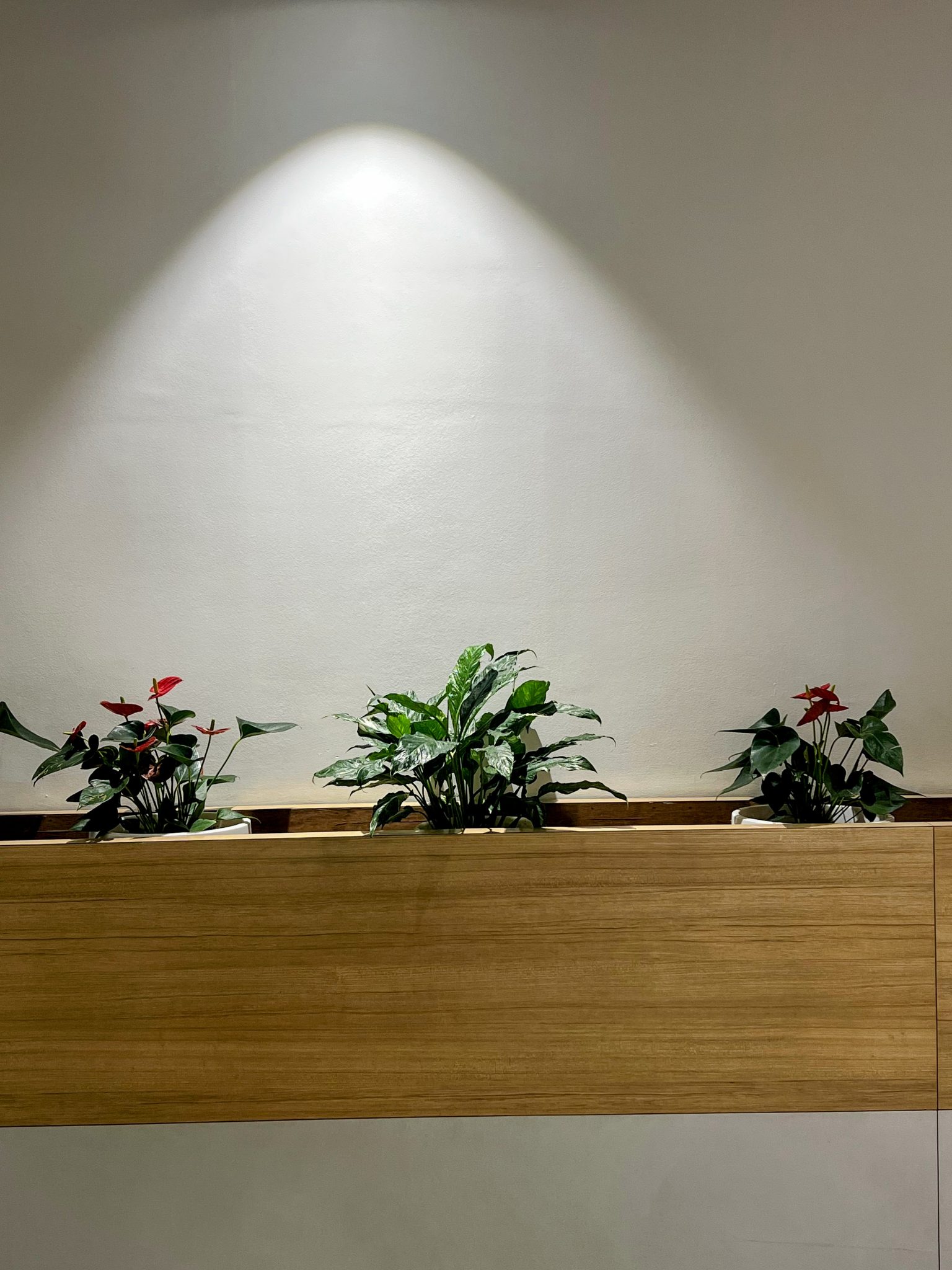 Alternative Text: Three potted plants are arranged on a wooden shelf against a white wall with a bright spotlight shining down from above. The two outer plants have red flowers and the middle plant has green foliage.