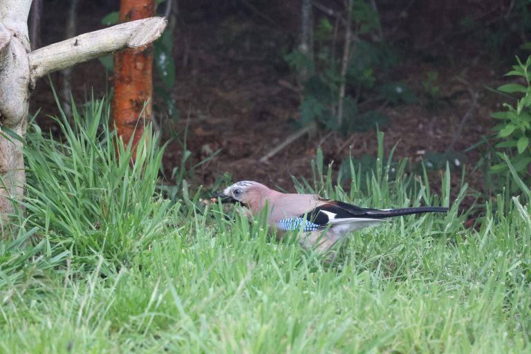 Alternative Text: Jay bird eating a peanut, standing in a grassy wooded area.