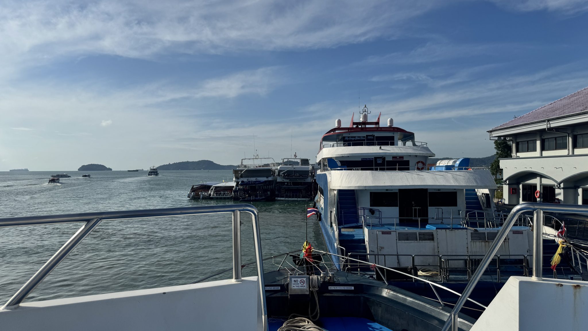 Alternative Text: A view from the front of a passenger ferry looking toward several other ferries docked at a pier under a blue sky.
