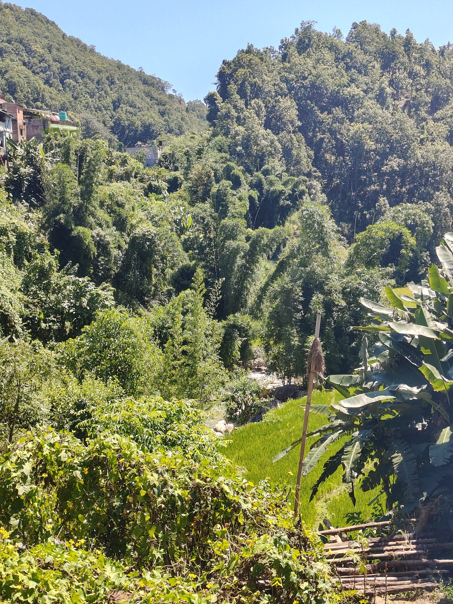 Alternative Text: A lush, green landscape featuring a variety of vegetation, including dense trees and bamboo.