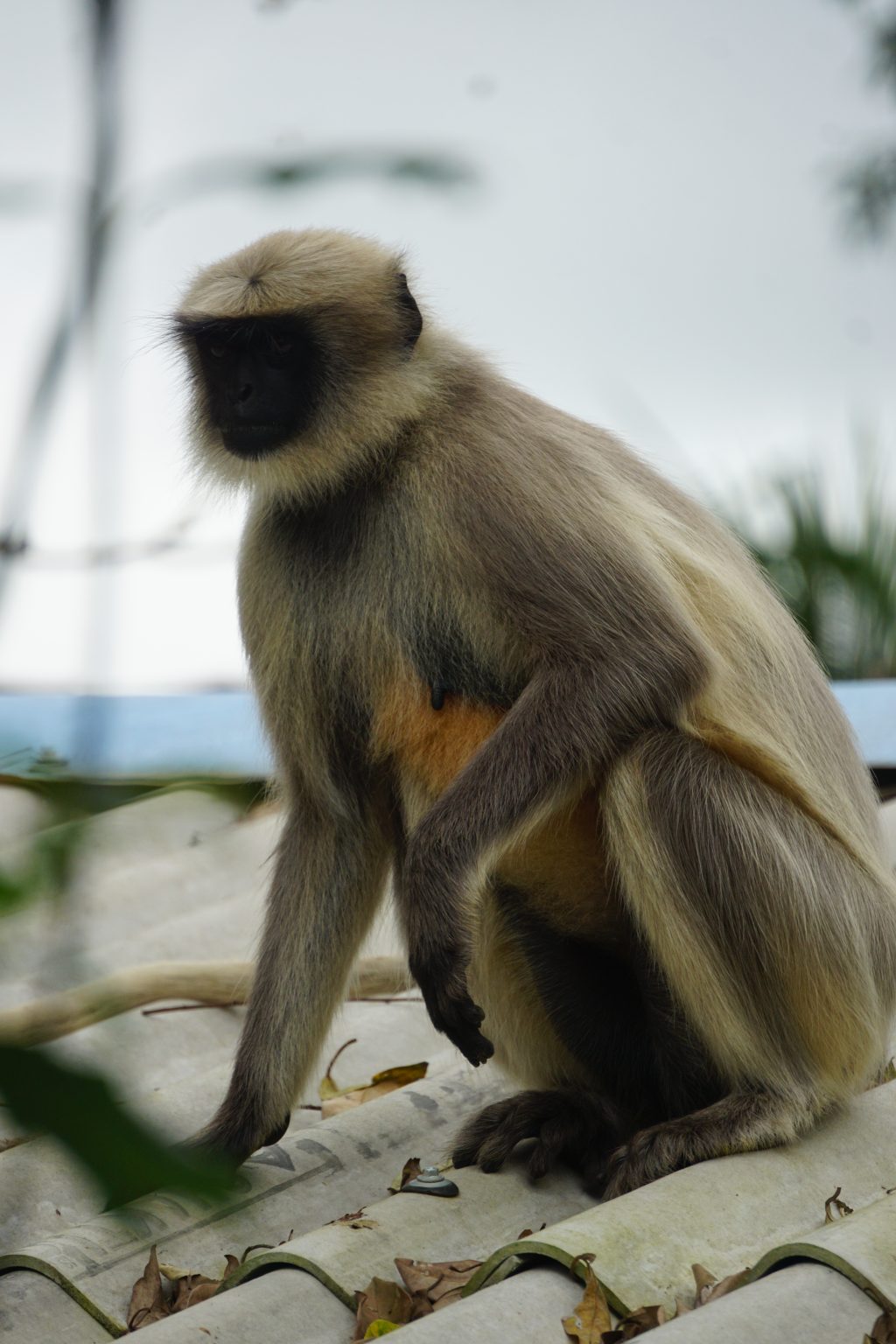 Alternative Text: A monkey with light brown fur and a dark face is sitting on a corrugated roof covered with dried leaves.