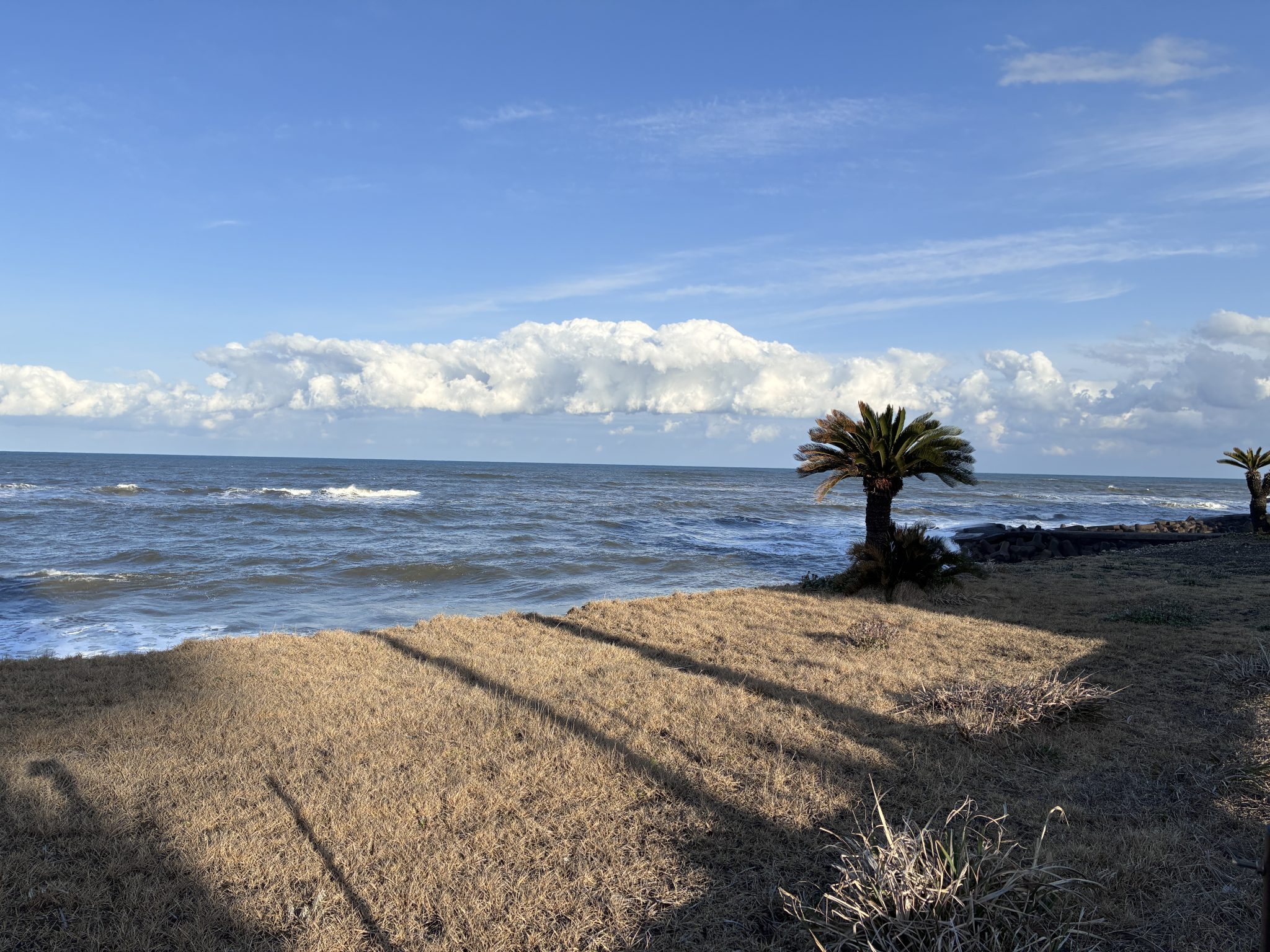 Alternative Text: A coastal scene featuring a sandy area with dry grass in the foreground, leading to the ocean with gentle waves.