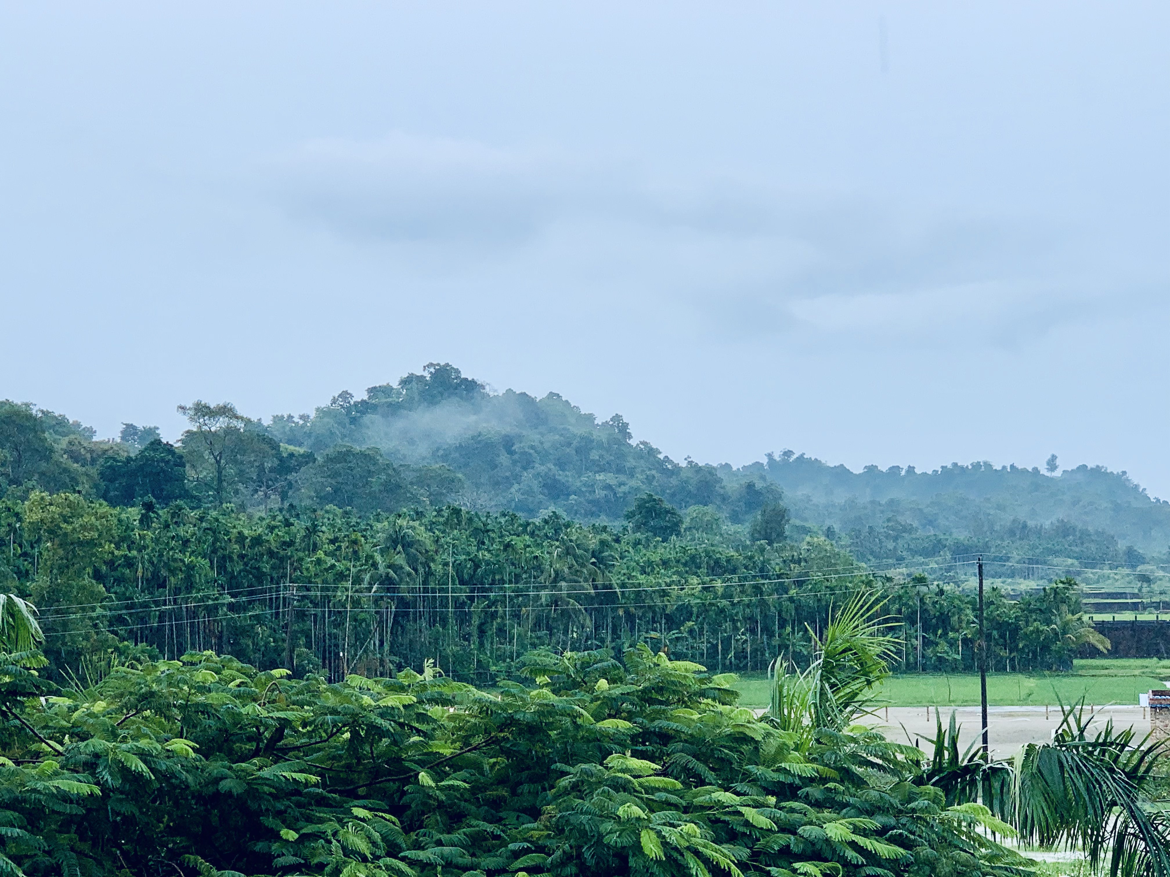 Alternative Text: The mountain reaches the clouds, covered in greenery.
