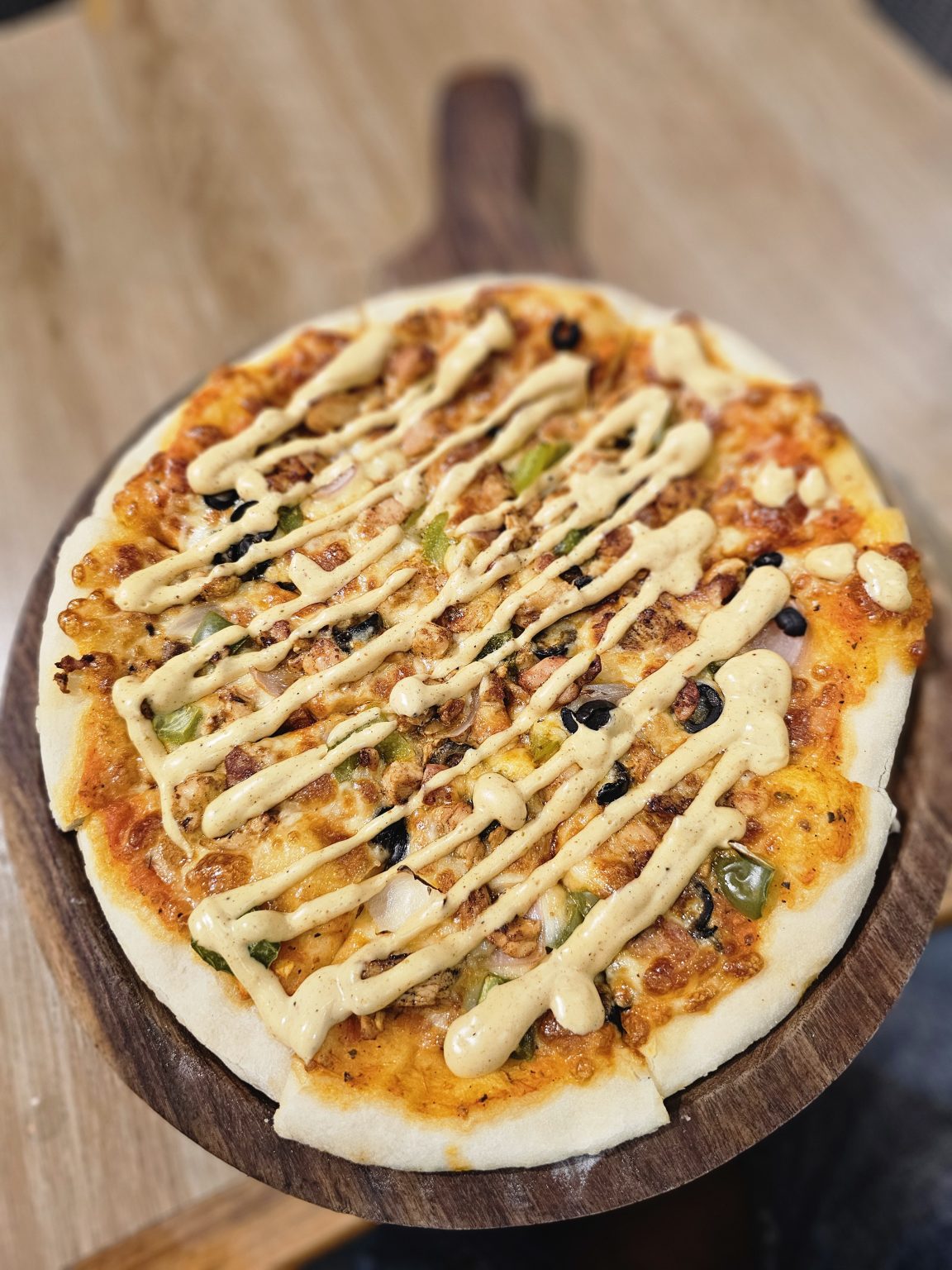 Alternative Text: A fusion pizza, topped with chicken, green peppers, onions, and black olives, drizzled with a creamy sauce. It is placed on a wooden board. Spotted it at a restaurant in Kozhikode, Kerala. #WPNP2025