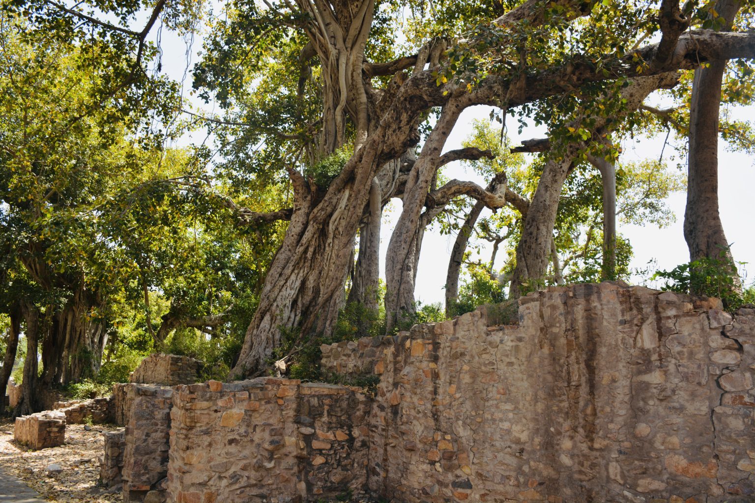 Alternative Text: A massive twisted Ficus benghalensis tree beside the ancient ruins of Bhangarh Fort, Rajasthan, contrasts nature and history.