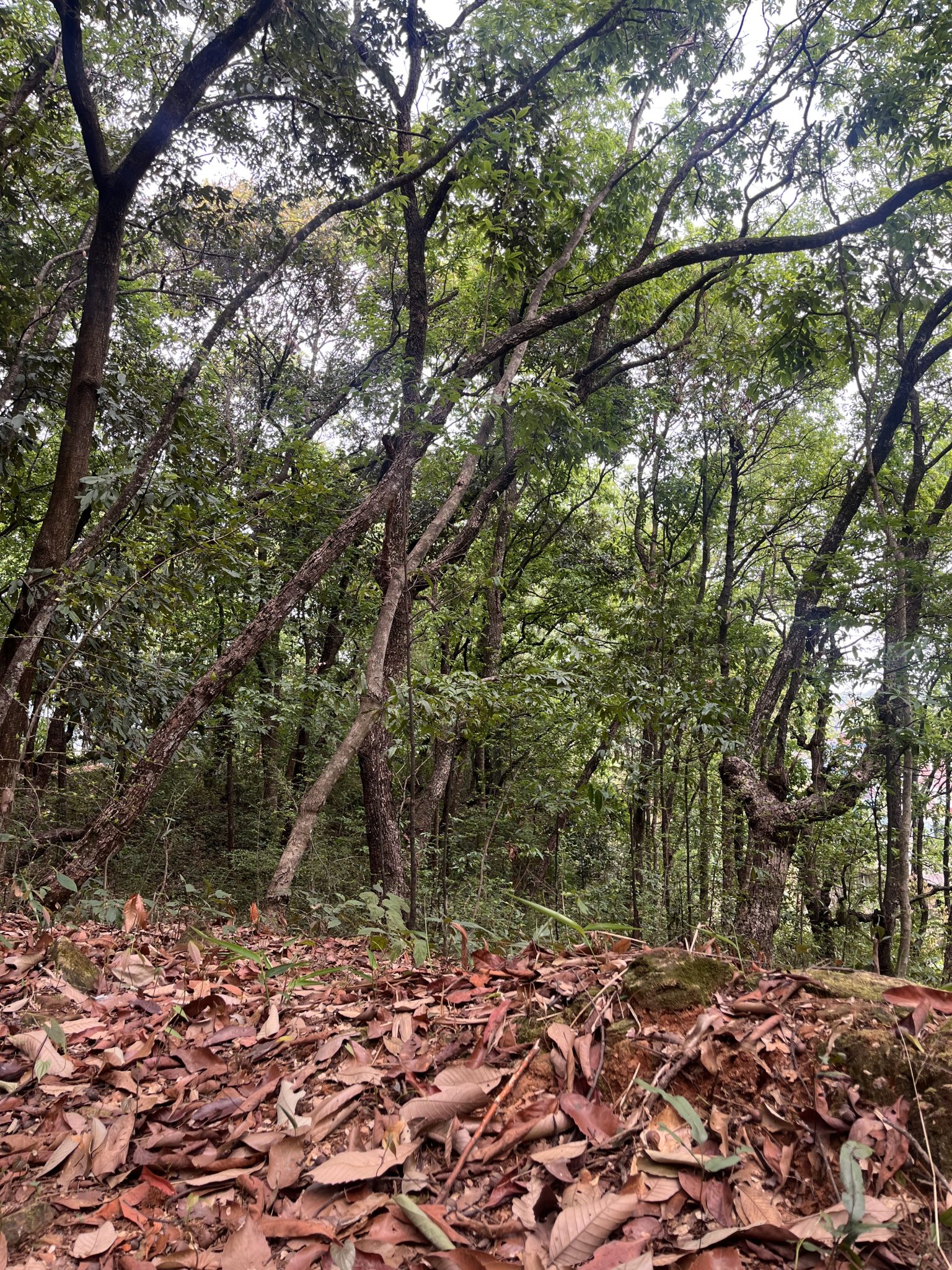 Alternative Text: A dense forest scene featuring tall, leafy trees with intertwining branches.