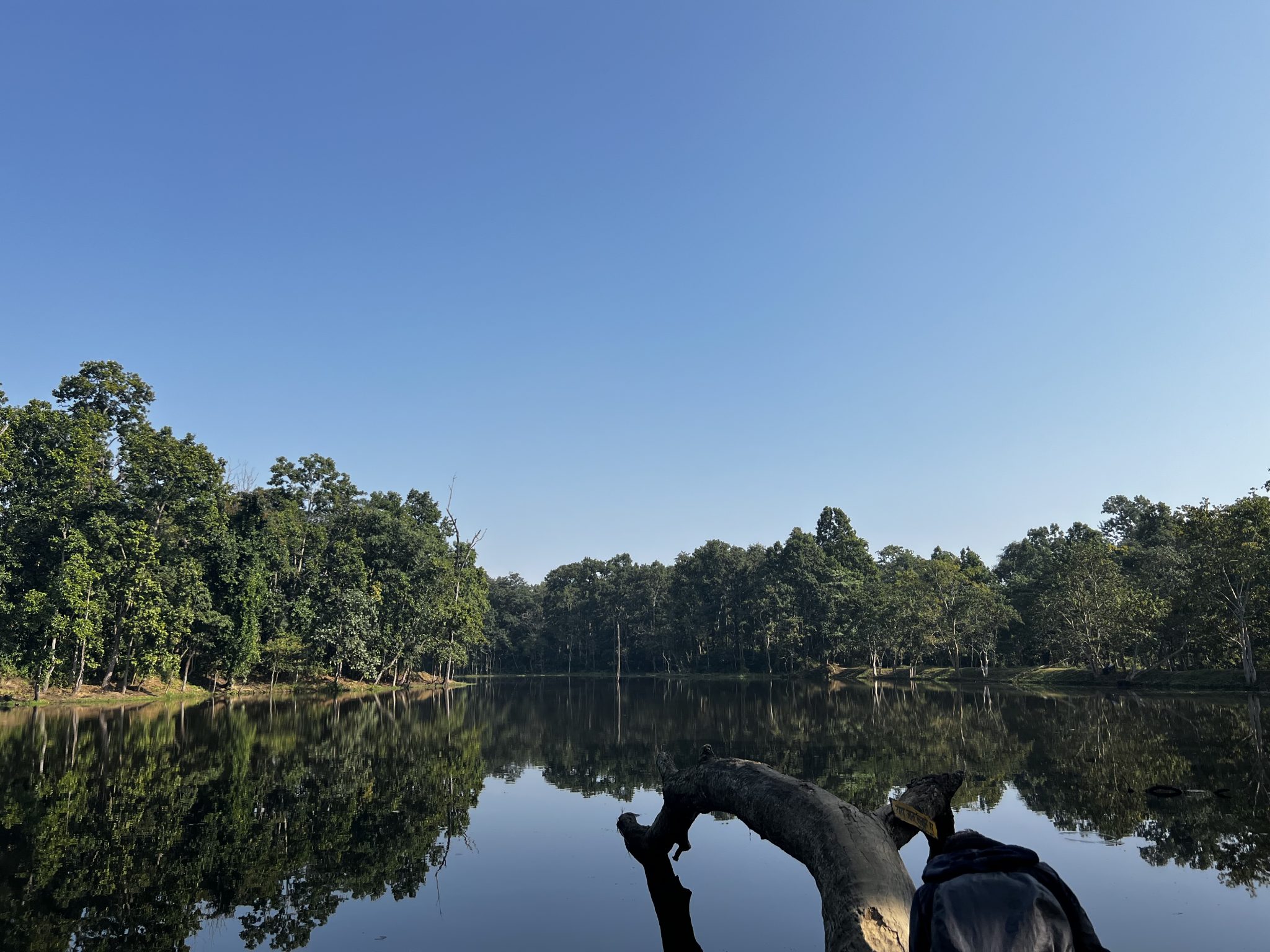 Alternative Text: A calm lake reflects lush green trees, with a large bare branch extending into the foreground.