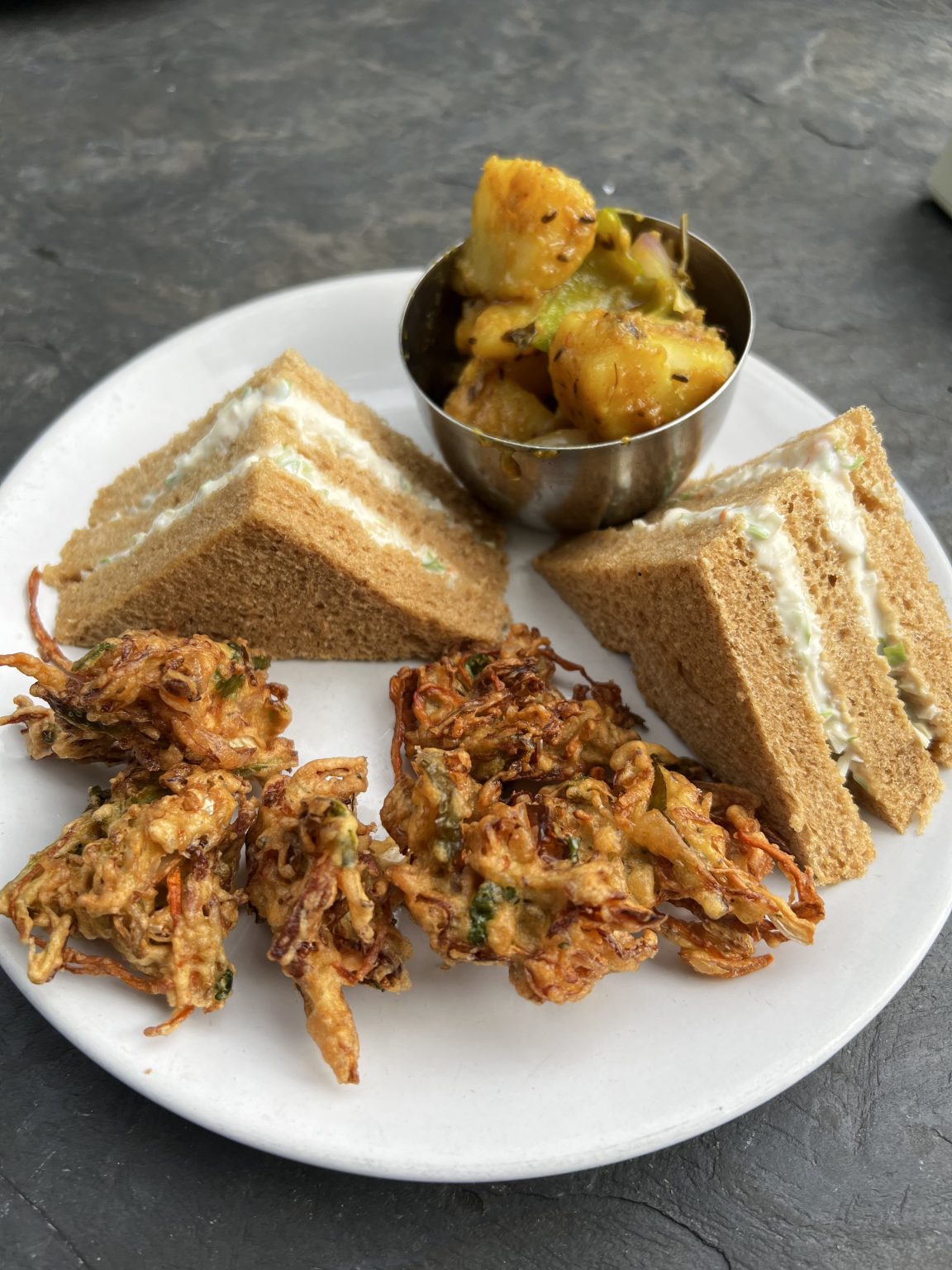 Alternative Text: A plate of breakfast with vegetable fritters, triangle sandwiches, and a bowl of potato curry.