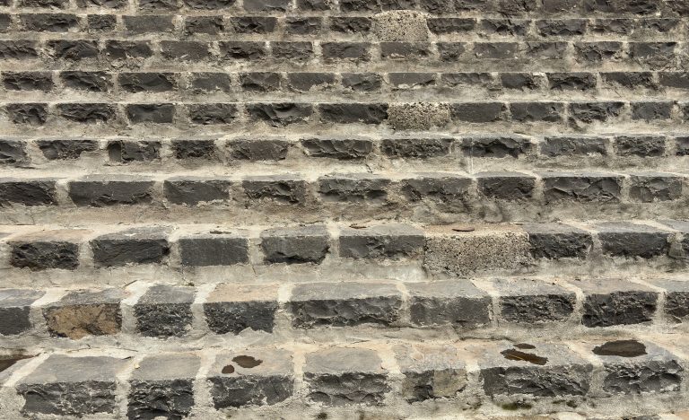 Alternative Text: A close-up view of stone steps showing uneven, textured surfaces with visible wear and tear.