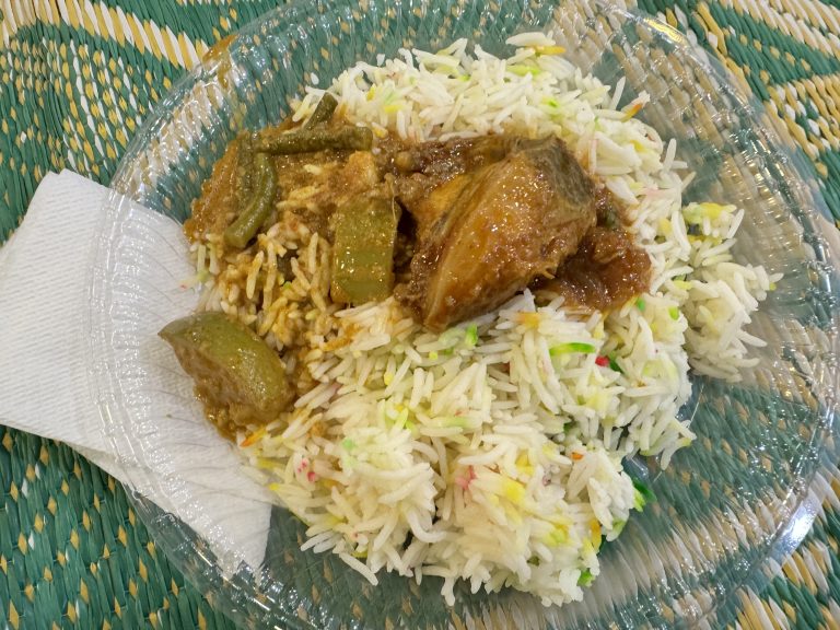 Alternative Text: A plastic plate on a green mat with colorful basmati rice topped with fish curry and green vegetables.