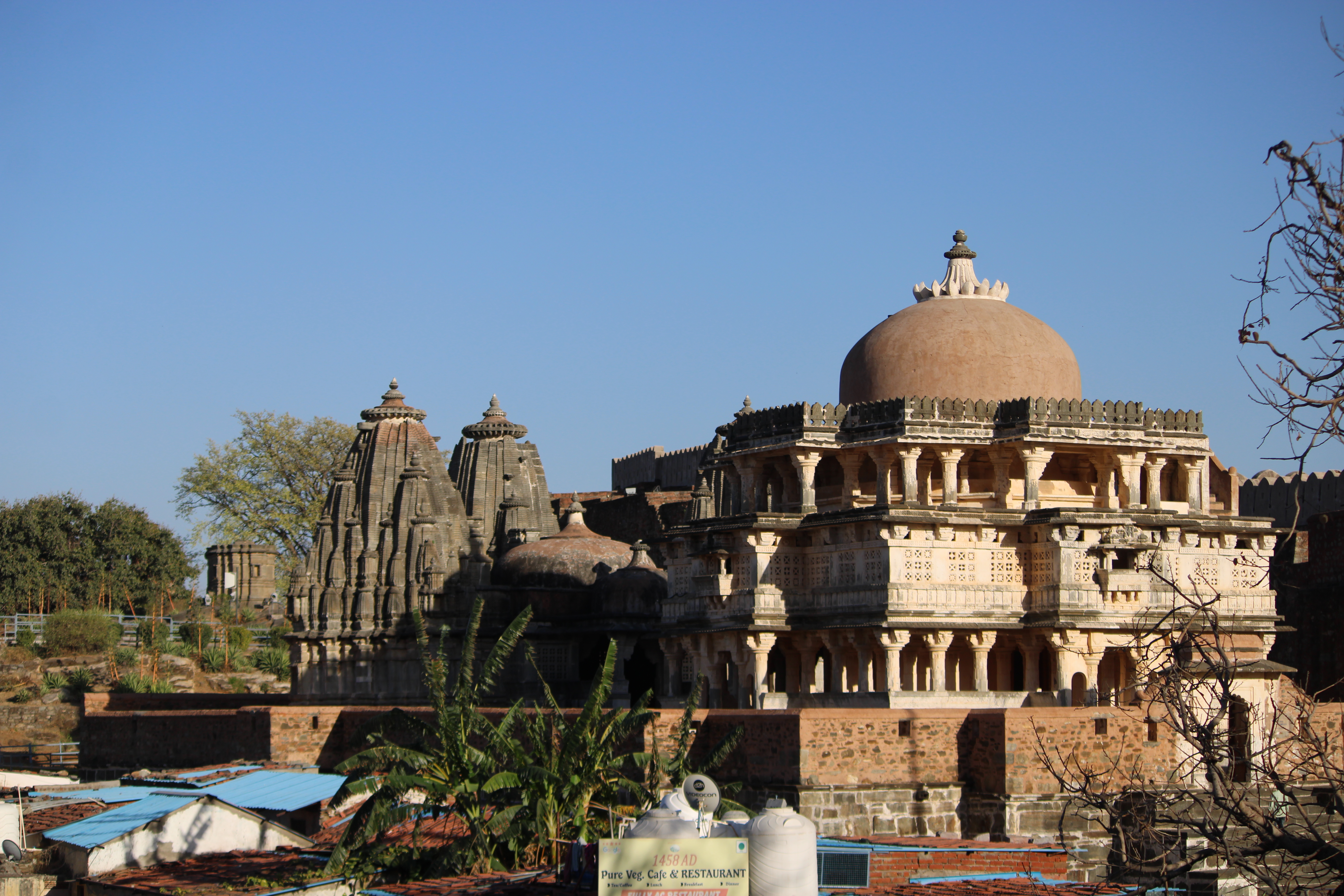 Alternative Text: Ancient stone temple complex with intricate carvings and a large dome, set against a clear blue sky. Vegetation and smaller structures are visible in the foreground.