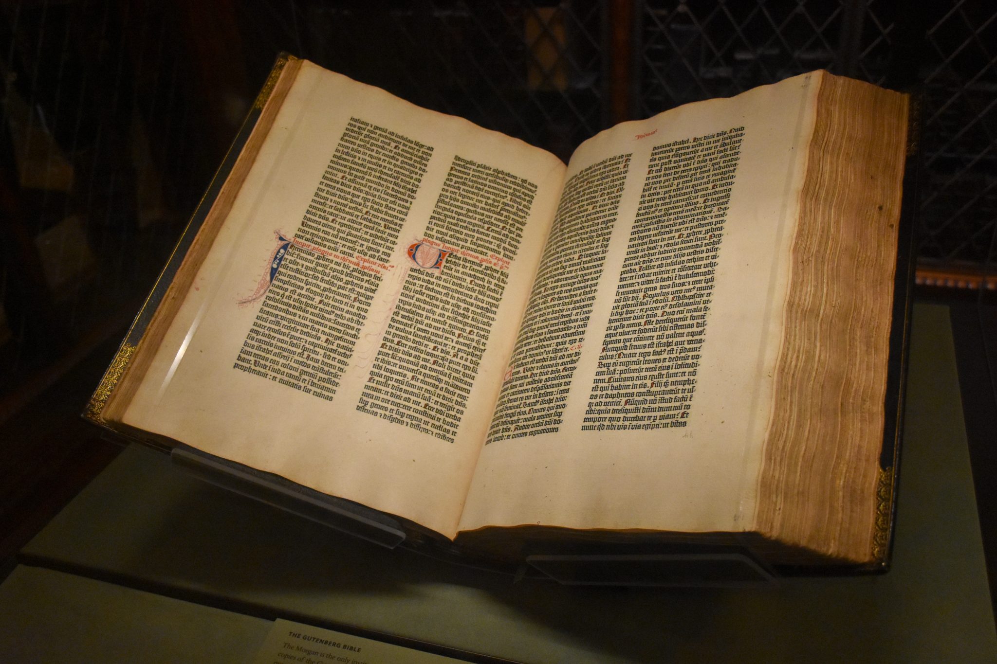 Alternative Text: One of the original copies of the Gutenberg Bible in the Morgan Library in New York