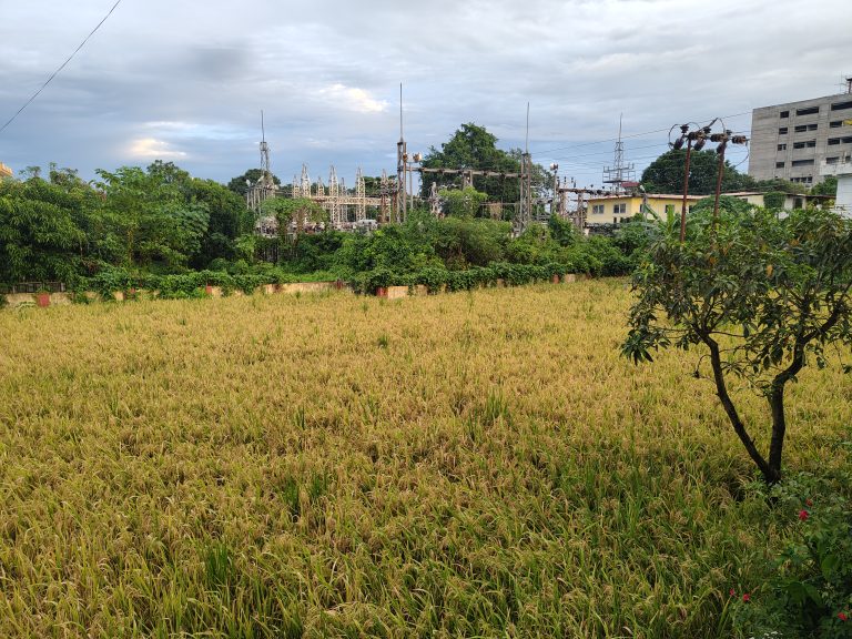 Alternative Text: A golden rice field surrounded by greenery, with utility poles and a building in the background.